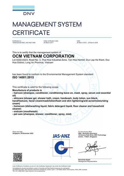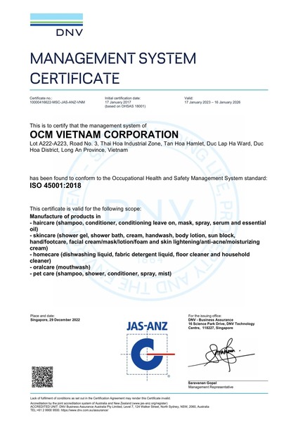 Officially put into operation in 2015, OCM Vietnam has continuously invested in modern equipment and implemented quality management systems that adhere to internationally recognized standards, such as cGMP, FDA, ISO 22716, ISO 14001, and ISO 45001. These practices emphasize OCM Vietnam’s unwavering commitment to the strictest quality standards, product excellence and environmental responsibility.