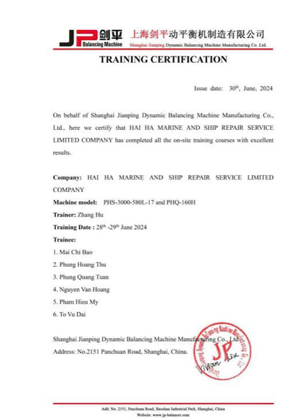 On-site training certificate for dynamic balancing machine operation
