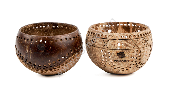 A range of handcrafted products carrying distinctive aesthetic and cultural value, such as coconut shell scented candles, coconut wood tea sets, coconut shell bowls, and finely crafted coconut fiber paper artworks.