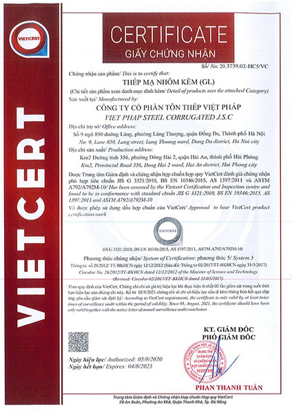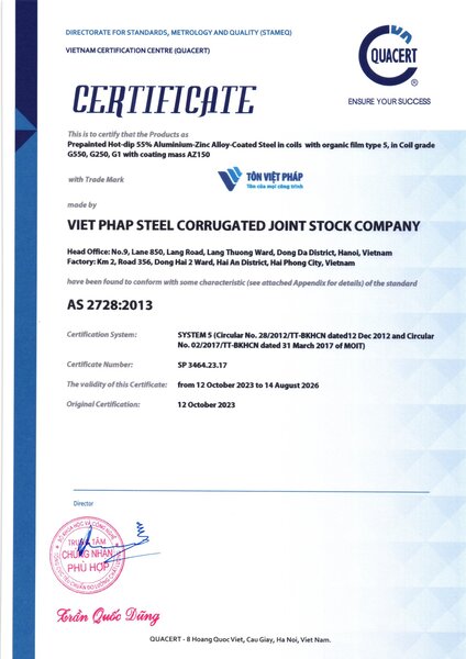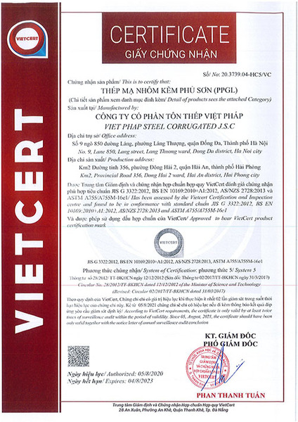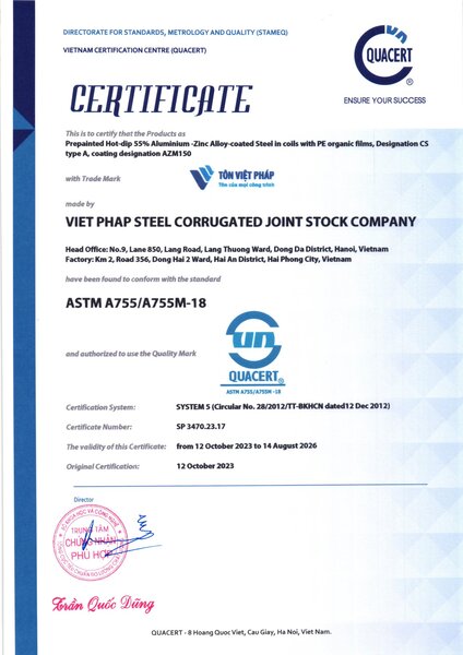 ➪ Viet Phap Steel Corrugated factory proudly meets stringent international certifications and standards such as ASTM (USA), Standards Australia, ISO 9001, JIS (Japan), VNSTEEL, and European Standards, etc. affirming our commitment to delivering globally qualified products for all projects.