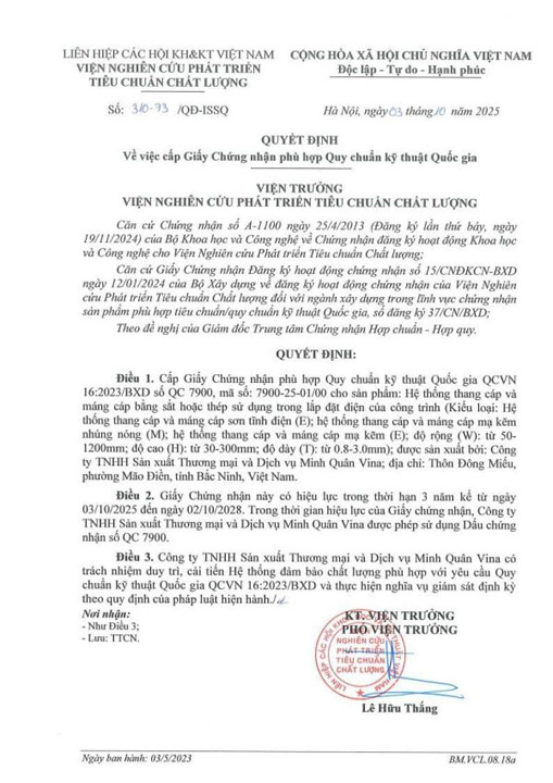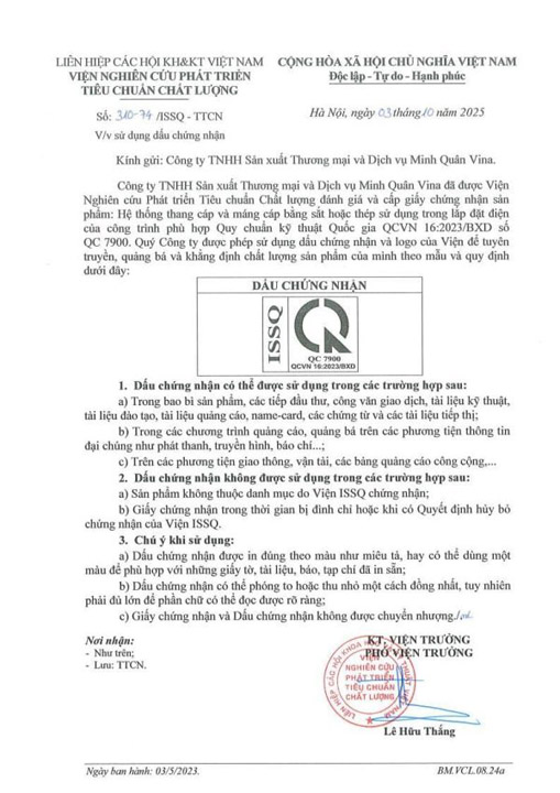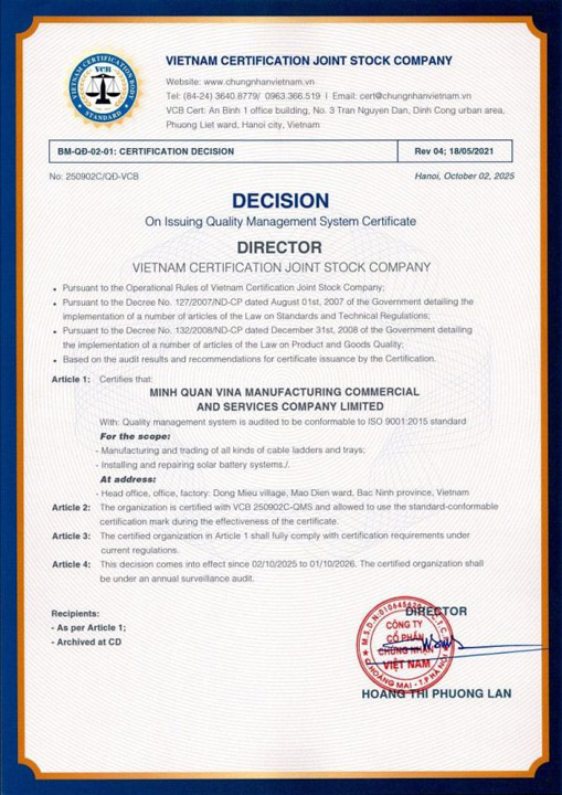 ☞ Minh Quan Vina is proud to be the first manufacturer in Vietnam to obtain certification for the entire range of Cable Ladder and Cable Tray products in accordance with QCVN 16:2023/BXD standards. In parallel, its product systems comply with TCVN standards and current technical regulations, accompanied by full CO, CQ, and comprehensive quality documentation.
