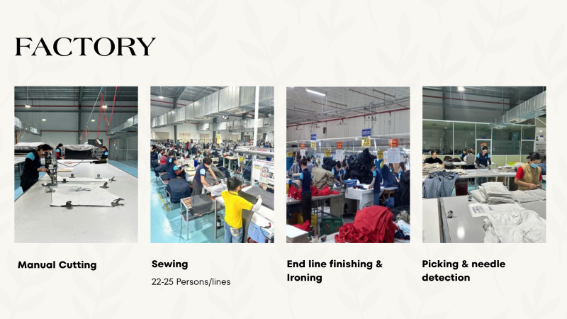 We provide an integrated supply chain from procurement to shipment, applying a strict AQL quality control system. Our factory is accredited with WRAP Gold, BSCI, RCS, and HIGG certifications.