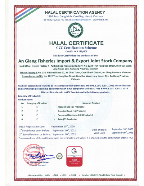 AGIFISH is permitted to export seafood products to the EU market with 4 codes: DL07, DL08, DL09, DL360 and is certified with HALAL to export to both domestic and international Muslim communities.