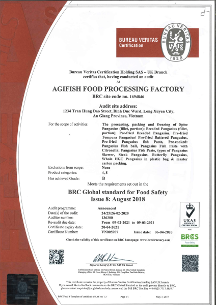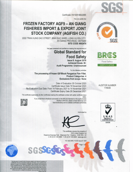 AGIFISH applies quality management systems throughout the entire production process: HACCP, Global Standard For Food Safety (BRC), ISO 17025:2005, ISO 14001:2004. The ASC standards for the raw material pangasius farming area and the companys processing plant have been certified by international organizations.