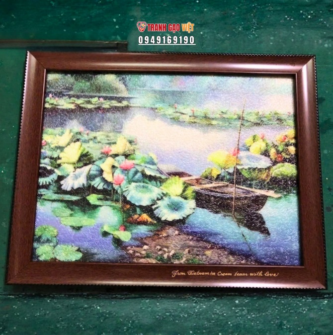 Lotus Pond in Bloom Landscape Rice Painting is a handcrafted rice artwork that recreates the image of a lotus pond in full bloom - an enduring symbol of elegance, purity, and peace in Vietnamese culture. The piece is made from naturally roasted rice grains, meticulously arranged by skilled artisans to evoke a gentle, calm, and contemplative feeling.
