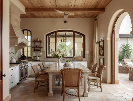 Natural Textures: Stone, wood, and woven materials evoke the authenticity of Mediterranean craftsmanship.