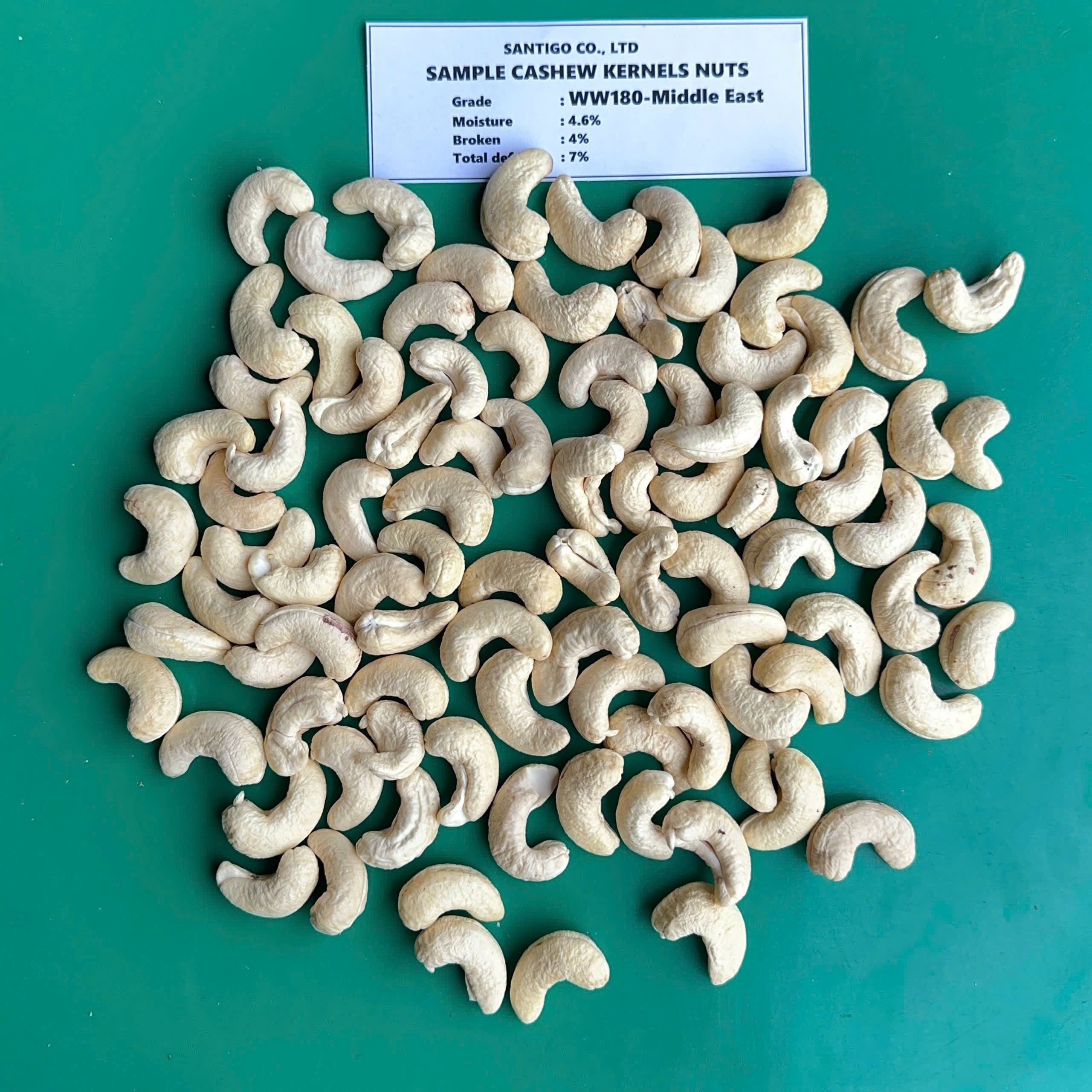 - Grade: W180 (White Whole Cashew Kernels)